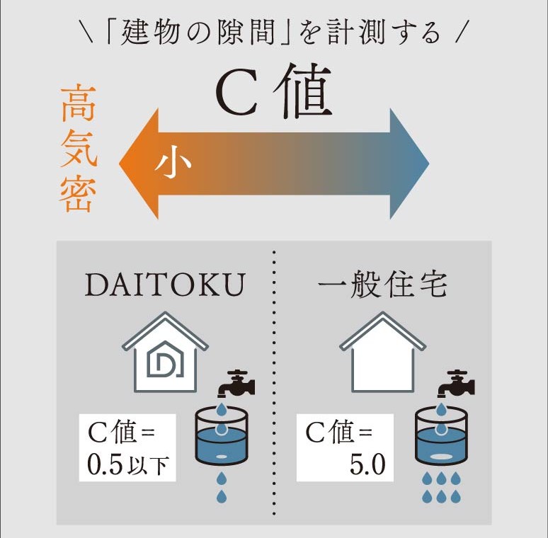 なお、DAITOKUがお約束しているC値は0.5[cm2/m2]以下になりますので、高性能な住宅の指標である気密性能の高い超高気密住宅とも言えます。
