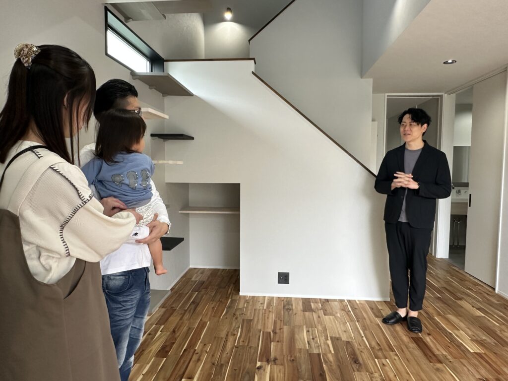 A様ご家族の笑顔と笑い声が新しいお家いっぱいに広がっていて、「これからこのお家で始まる新しい暮らし」が目に浮かぶようでした。