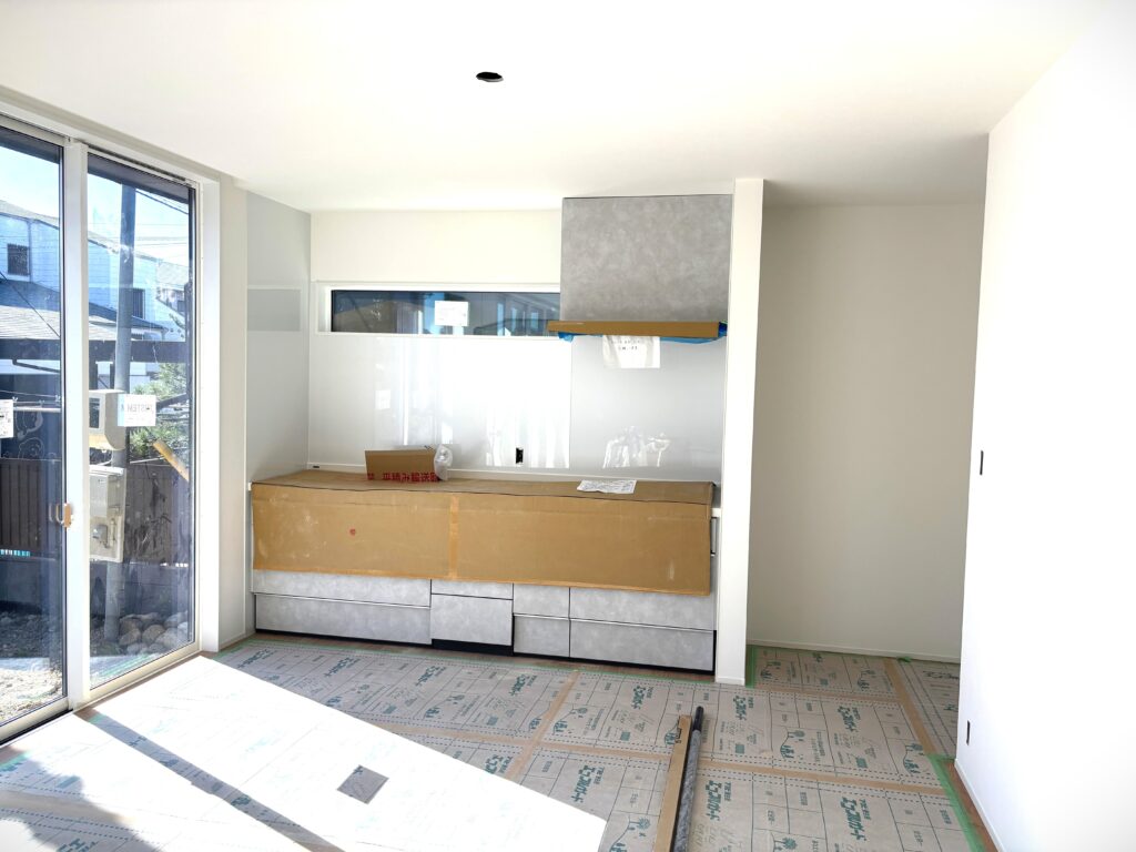 まだ養生が残っていますが、完成まで傷がつかないよう保護をします。毎日の暮らしの中心となるキッチン。