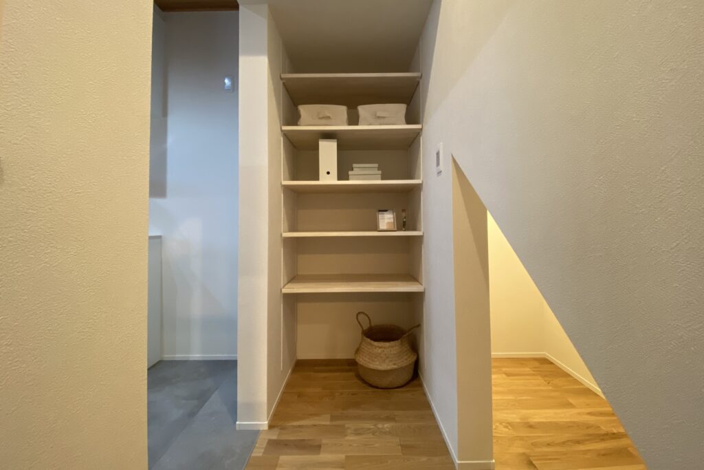 パントリー横には階段下収納。LDKからは見えにくいので、細々したものはこちらに整理することで雑多な生活感を納めることができます。