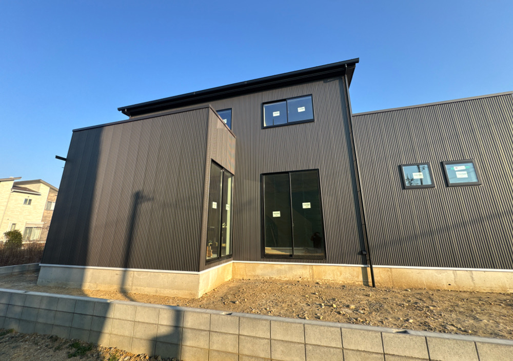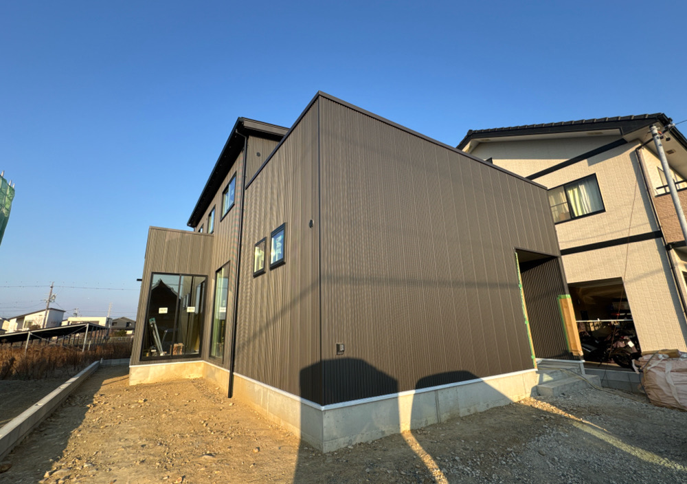 今まで隠れていた外観が見えるようになったことで、お客様にも「自分たちの家がいよいよ完成するんだ」という実感を、より一層強く持っていただけるのではないでしょうか。あらためて全体を見渡すと、職人さんの手による板金施工が非常に美しく、シンプルながらも重厚感のあるカッコイイ仕上がりになっています。