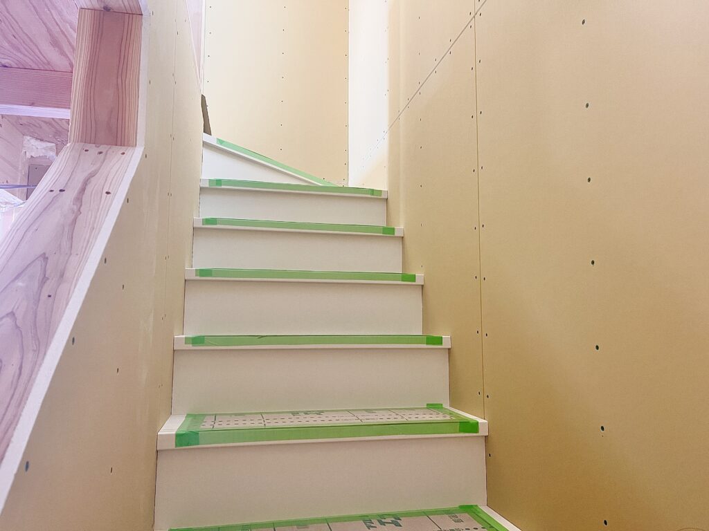 現在は傷がつかないように養生(保護カバー)をしていますが、この下には白系の美しい階段が隠れています。養生が外れた時、空間全体がパッと明るくなり、自然と気持ちも明るくなるような仕上がりになっているはずです。その瞬間が今から楽しみです。
