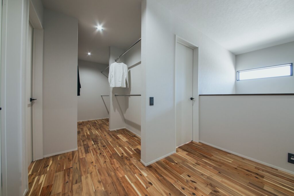 子供部屋にはあえて収納を設けず、2階の収納は「ファミリークローゼット」として1箇所に集約しました。ご家族のライフスタイルは、10年、20年と時が経つにつれて必ず変化します。将来、お子様が進学や結婚で独立された後のことまで考えると、各部屋に収納を分散させるよりも、1箇所でまとめて管理する方が圧倒的に効率的で、無駄なく空間を使い続けられるからです。