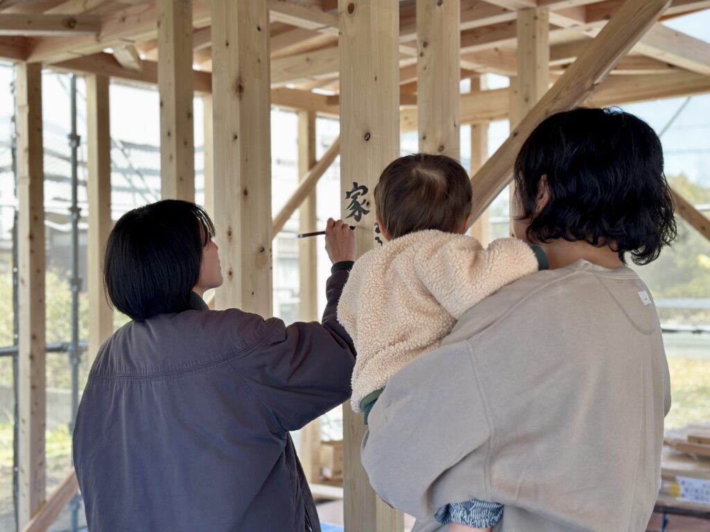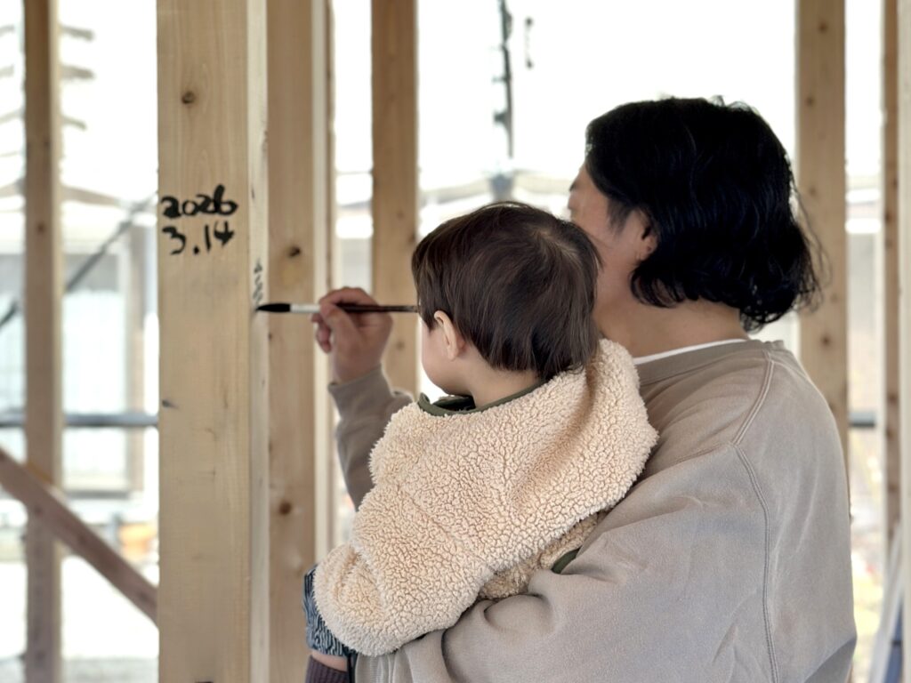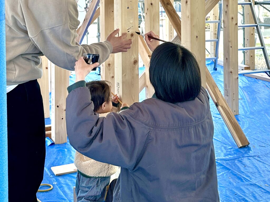 そして今日は「願い筆入れ」。願い筆入れとは、建物の柱にご家族の名前や願いごとを書く、家づくりの記念イベントです。完成後は見えなくなる柱ですが、「この家で家族が幸せに暮らせますように」という想いを込めて筆を入れます。
