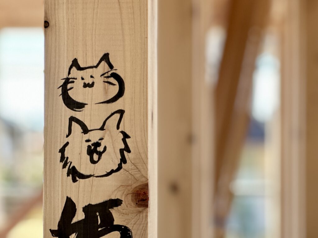 柱にはご家族のお名前に加えて、一緒に暮らす5匹の猫ちゃんとワンちゃんの名前を書き記してくださいました。柱に並んだ名前を見ながら、完成後の暮らしを想像して私たちも自然と笑顔に。奥様がサラッと書かれたイラストがすごく可愛くて思わず撮影…!