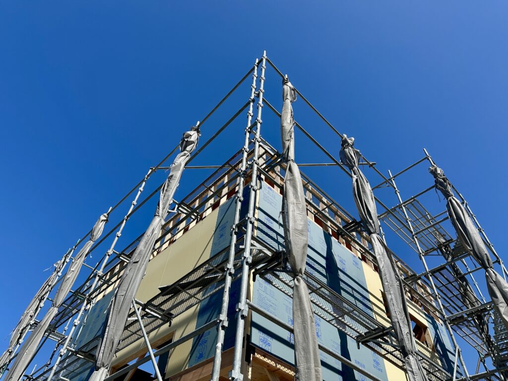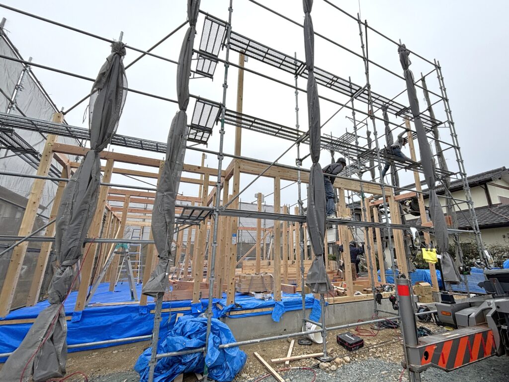 昨日の上棟当日は、雨の心配もなく動きやすい気候。朝から大工さんたちが集まり、声を掛け合いながらどんどん柱や梁が組み上がっていきました。ベテラン職人さんたちの手際の良さと丁寧さは本当にすごいですね。毎回驚かされます。