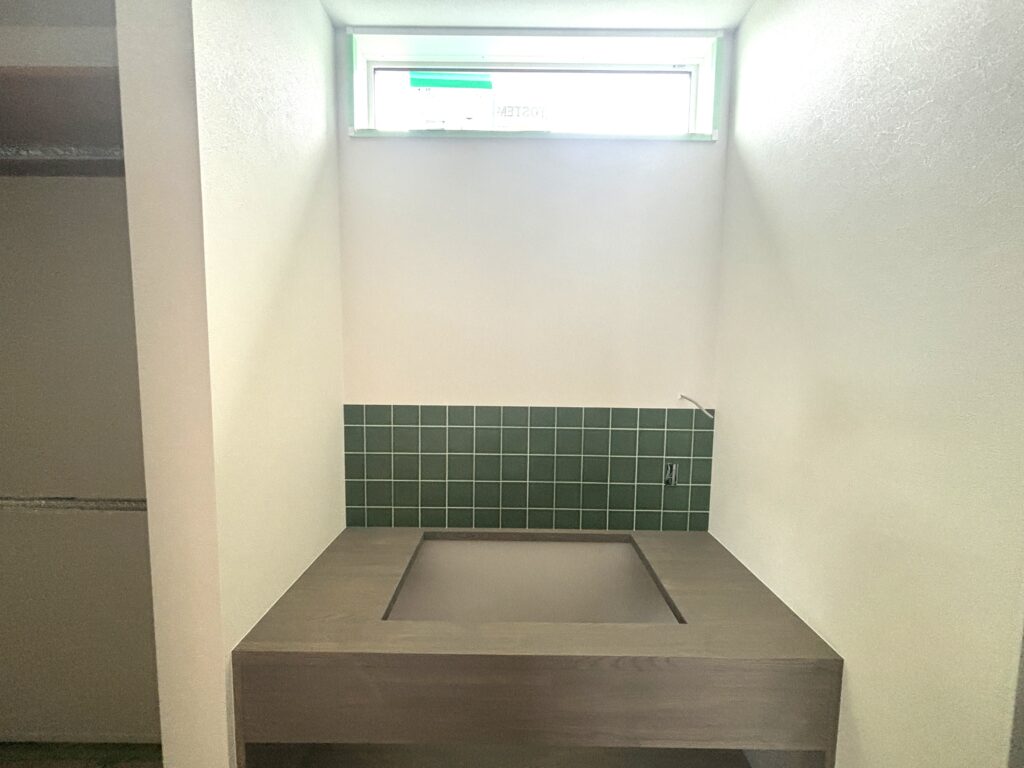 こちらは造作の洗面スペース。落ち着いた色味のカウンターと、深みのあるグリーンのタイルがアクセントになり、上品で心地よい雰囲気に仕上がっています。