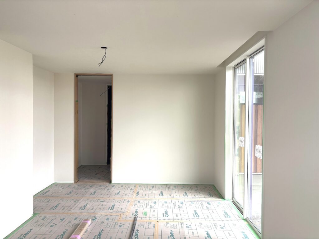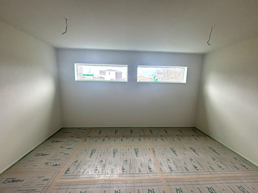外からの視線を気にせず、明るさをしっかり確保できる窓の配置も、この住まいの魅力のひとつです。床はしっかりと養生がされており、次の工程に向けて準備も万全です。