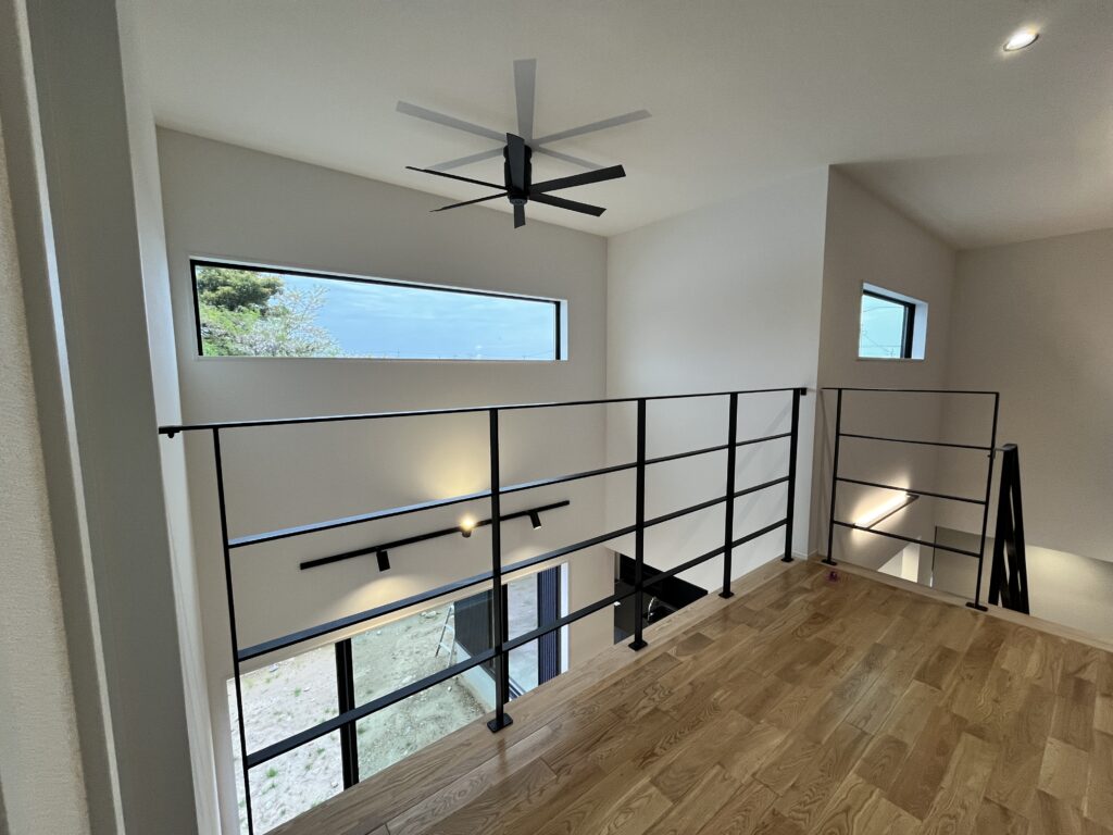 このお住まいの主役とも言えるのが、白い空間に佇む黒の鉄骨階段。 清潔感あふれるホワイトの世界に、マットなブラックのラインが加わることで、空間がグッと引き締まり、洗練されたモダンな印象を与えてくれます。まさに「カッコイイ」の一言に尽きる仕上がりです!