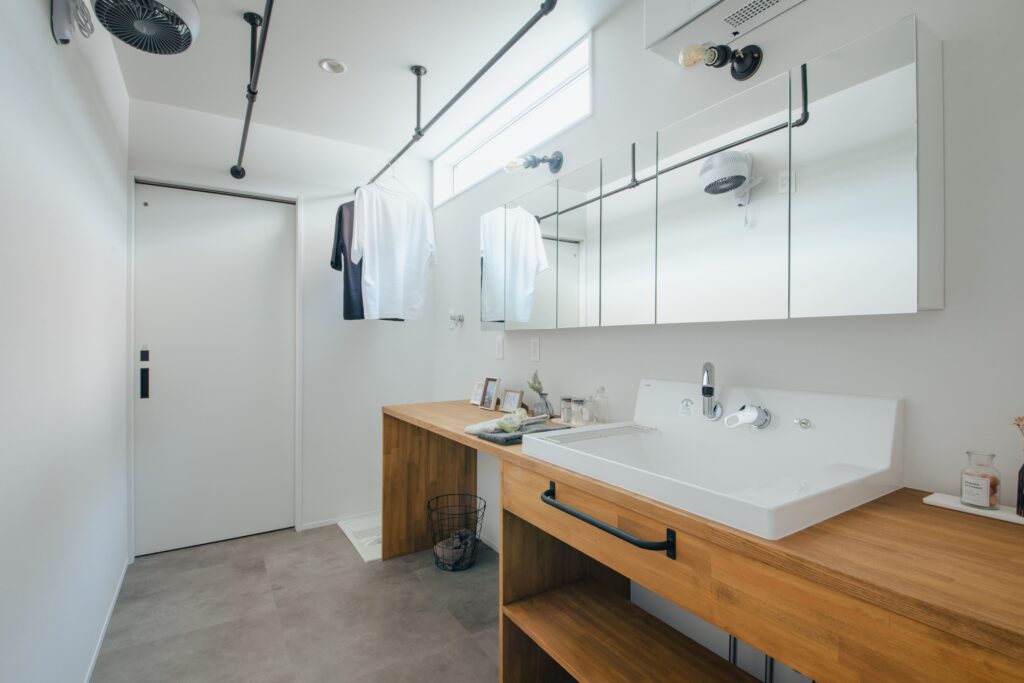 1階と2階にランドリールームを配置して大容量の室内干し空間を確保。カライエを設置した2階のランドリールームはWICに直結する動線で、洗濯後の移動の手間を軽減します。共働きや子育て世代にうれしい設計です。