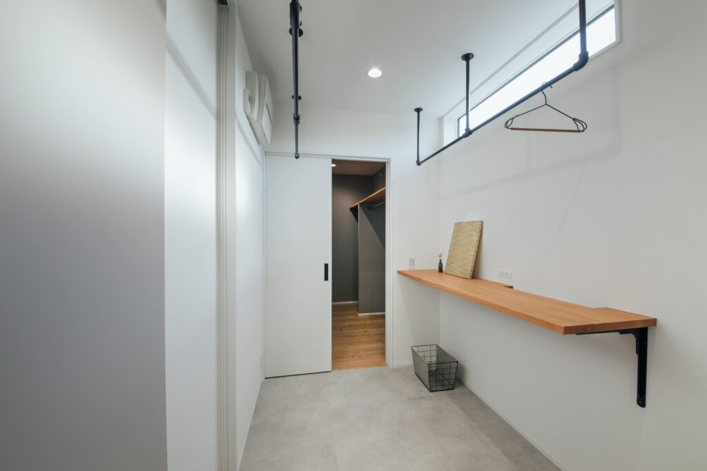 キッチン横のランドリースペースでは洗う・干す・しまうが一か所で完結。さらに寝室を玄関ホール近くに配置したことで、朝の支度から外出までがスムーズに。ランドリールームを通じて寝室からLDKへの回遊も可能にし、生活効率を高めた賢い動線設計です。