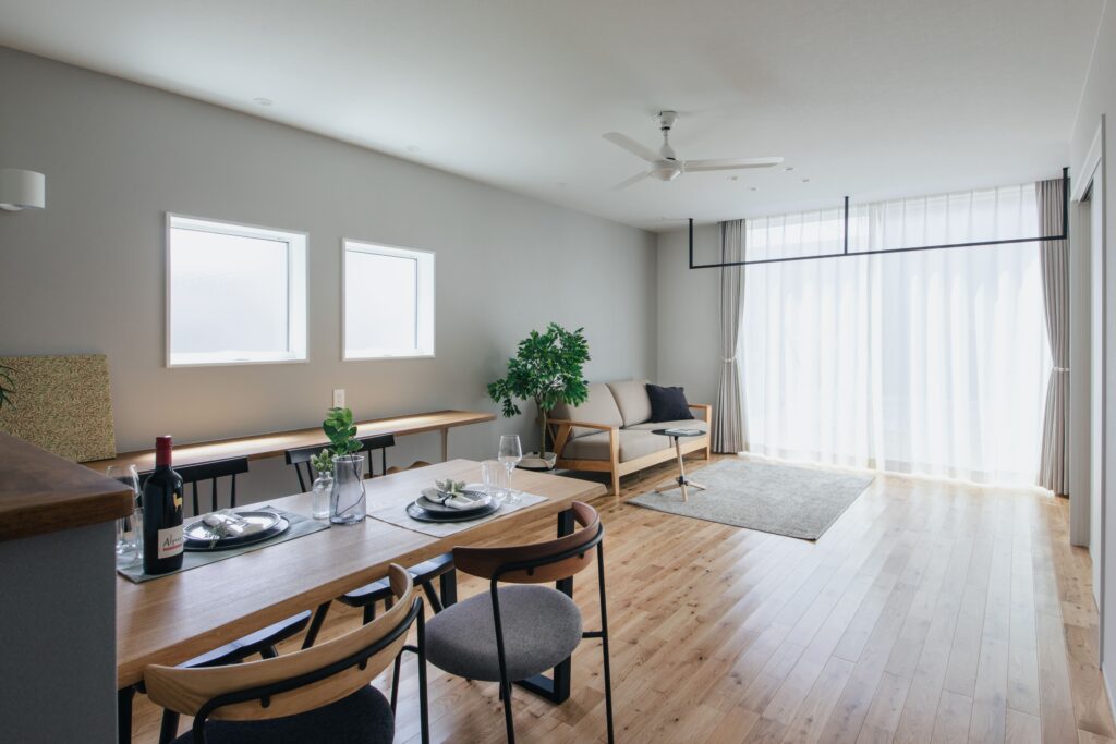 大きな窓からあふれる光に包まれる20.3畳のリビングは、自然と家族が集まる心地よい空間。壁付けのI型キッチンが広さをさらに引き立て、家具の配置も自在に。家族構成や暮らし方に合わせて変化できるレイアウトは、実際に訪れて体感したくなる魅力です。