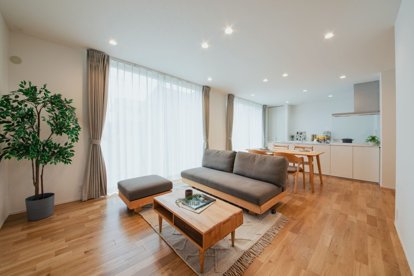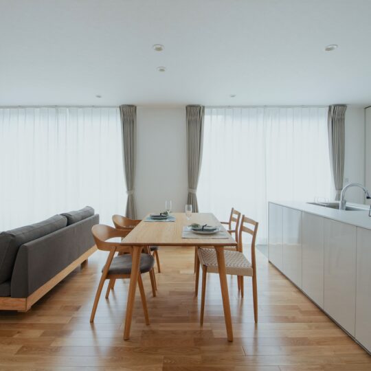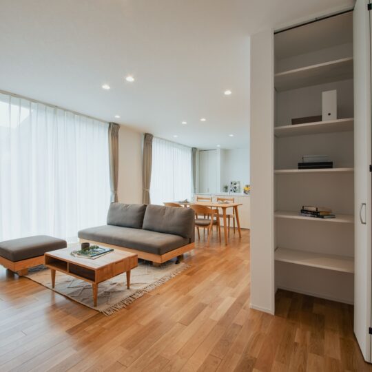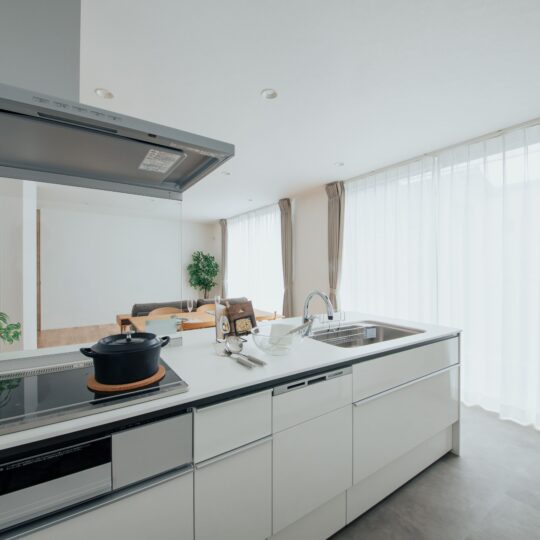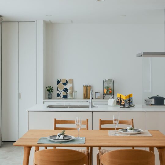白を基調にした明るい室内は、LDKに入った瞬間の視界を意識し、収納棚の配置によって“見せる”と“隠す”を巧みにコントロール。開放感を保ちながら、生活感を抑えた美しい空間を実現しました。ダイニングはあえて独立させ、食事以外の時間も快適に過ごせる多目的スペースに。自然光がたっぷり差し込む大開口の窓を設け、自然と家族が集まる心地よいLDKを実現しました。