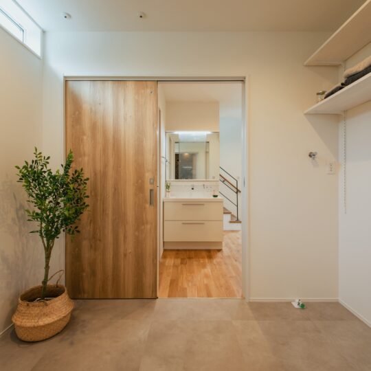 ダイニングから、ランドリールーム、浴室、洗面、玄関へとつながる回遊導線により、家事の負担を大幅に軽減。さらに各所に可動棚やハンガーパイプ付き収納をたっぷり設けることで、すっきりとした暮らしが続く工夫も。家族3人それぞれのプライベート空間と、みんなが集まる場所とのメリハリを大切に設計しました。