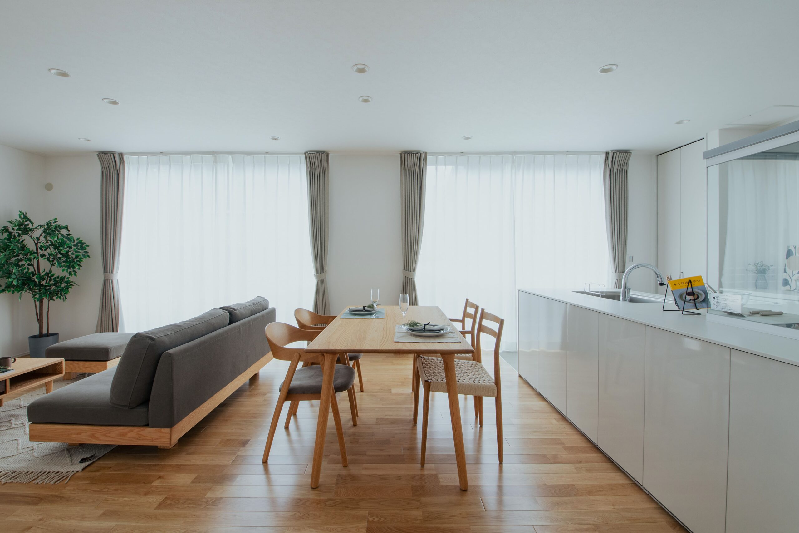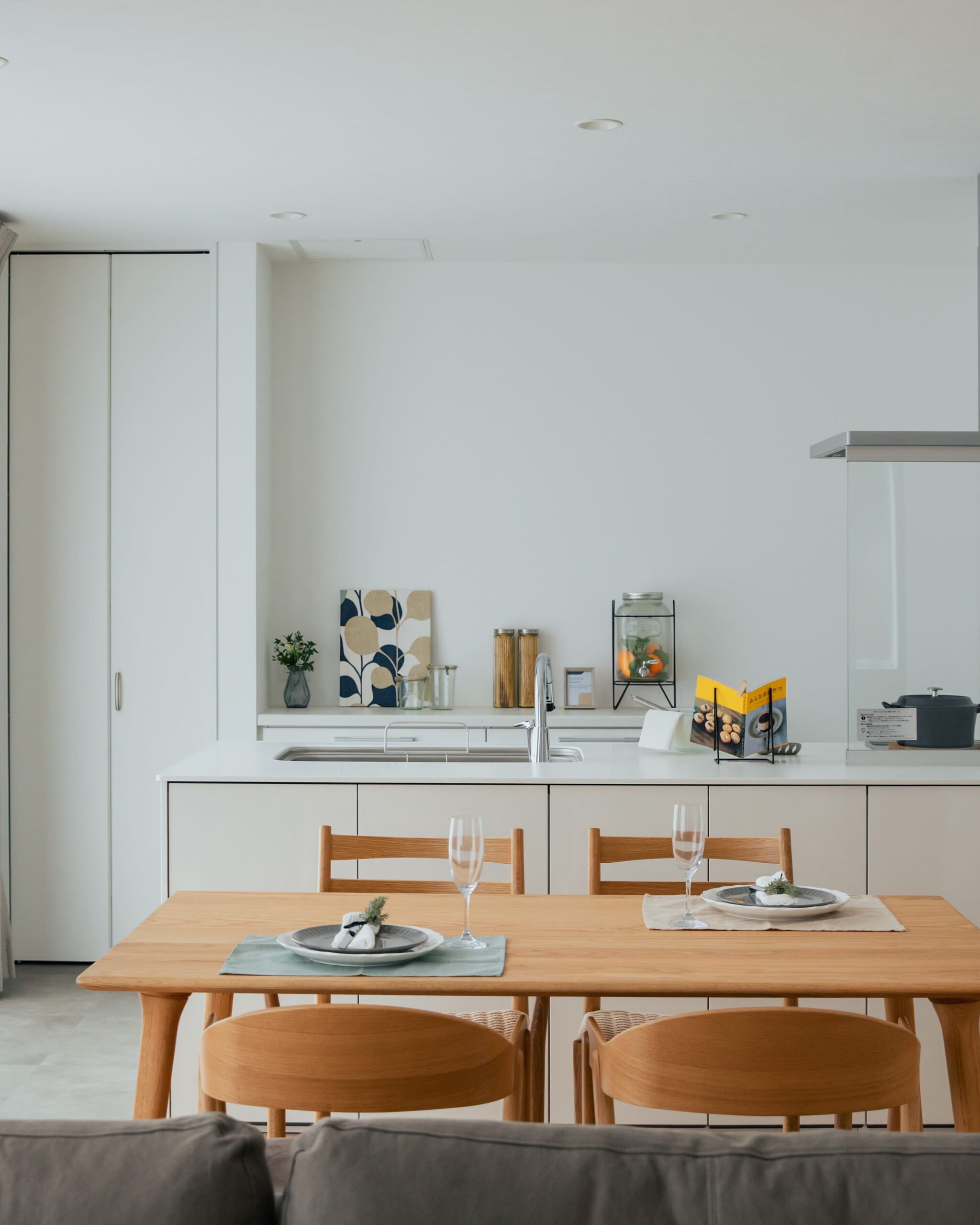 白を基調にした明るい室内は、LDKに入った瞬間の視界を意識し、収納棚の配置によって“見せる”と“隠す”を巧みにコントロール。開放感を保ちながら、生活感を抑えた美しい空間を実現しました。ダイニングはあえて独立させ、食事以外の時間も快適に過ごせる多目的スペースに。自然光がたっぷり差し込む大開口の窓を設け、自然と家族が集まる心地よいLDKを実現しました。