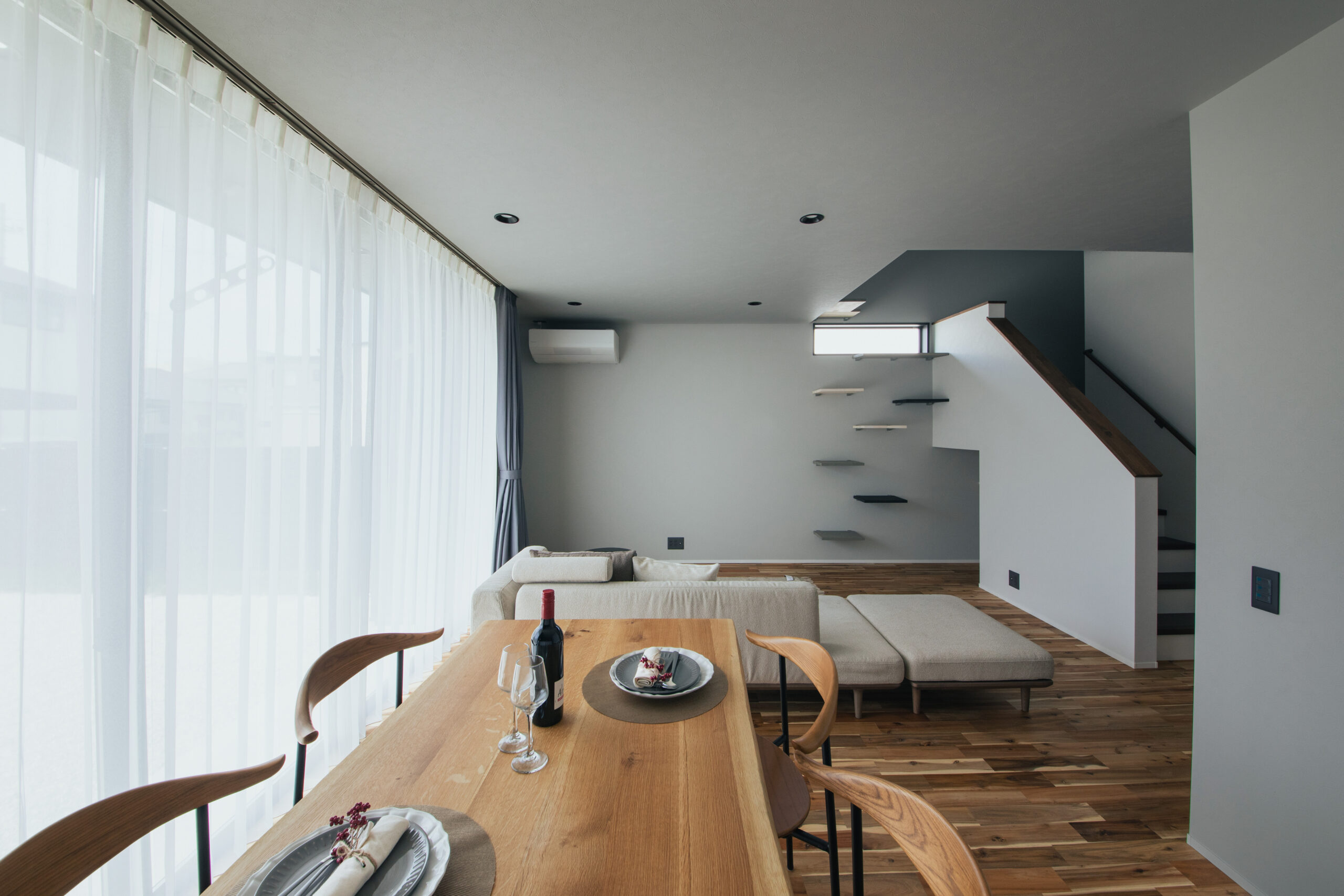 また、LDKから出られるテラスはアウトドアリビングとしても活用可能。猫好きのご家族の要望に合わせ、吹抜け部分を活用した2階へと続くキャットウォークや、猫が外を眺めやすい窓配置など、人も猫も快適に過ごせる工夫を施しました。耐震等級3に加えて制震ダンパーを設置し、デザイン性とご家族の安心を兼ね備えた快適な住まいです。