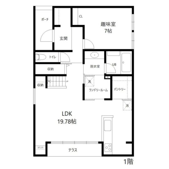 約20帖のLDKは家族が集まる中心として広さを確保し、パントリーや階段下収納、玄関クロークなど大容量の収納で家全体をすっきり保ちます。LDKと脱衣室の両方からアクセス可能なランドリールームにより効率的な家事動線をサポート。玄関近くに設けたご主人の趣味室は音漏れを考慮し、家族や来客を気にせず趣味を楽しめるプライベート空間となっています。
