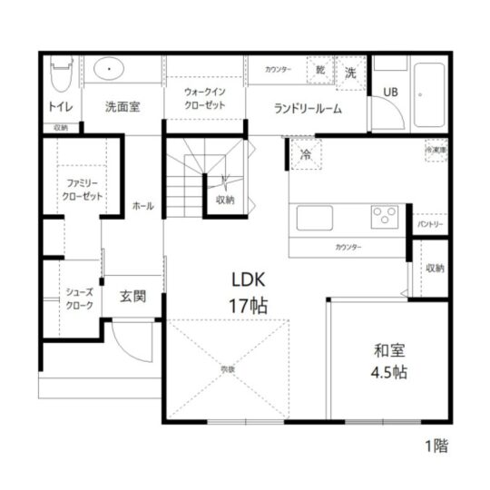 共働きで忙しいご夫婦が目指したのは、「何もしなくても快適に暮らせる家」。34坪3LDKの2階建て住宅は、ルンバがスムーズに動ける段差のない設計と、廊下を極力減らしたシンプルな動線が特徴です。将来も見据えて1階で生活が完結する間取りとし、ロールスクリーンで仕切れば客間兼寝室として使える畳スペースや、洗濯動線を考慮した1階のウォークインクローゼットを配置しました。