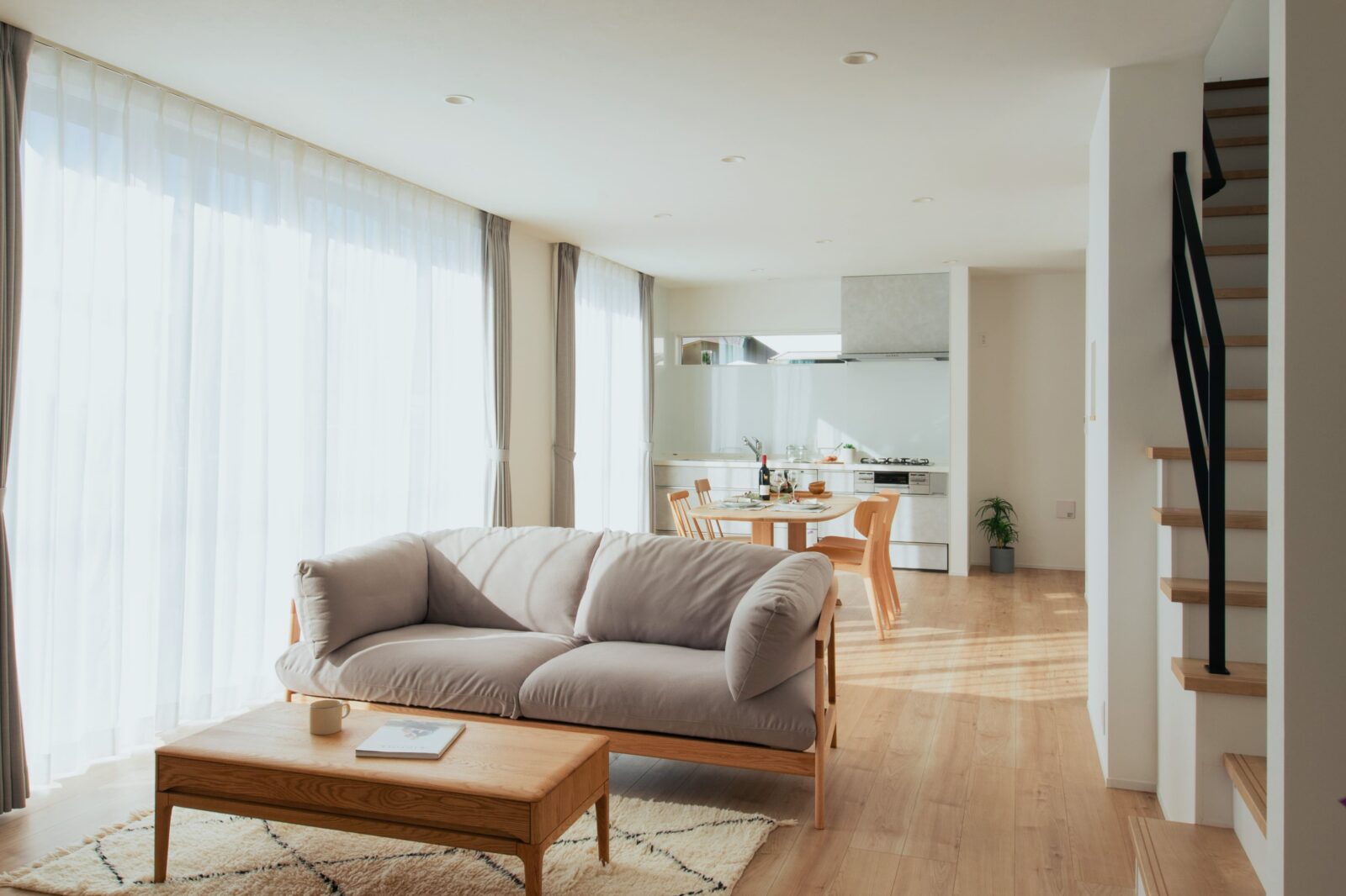 LDKは20.3畳のゆとりある広さを確保し、壁付けのI型キッチンによって空間全体を見渡せる設計に。キッチンからはランドリールーム、洗面、浴室へとスムーズにつながり、洗う・干す・しまうが無理なく行えます。さらに水回りは行き止まりをつくらず、LDKへと戻れる回遊動線にすることで、家事動線と生活動線が重なってもストレスを感じにくい構成としました。忙しい朝や来客時にも、動きが滞らない工夫が随所に施されています。