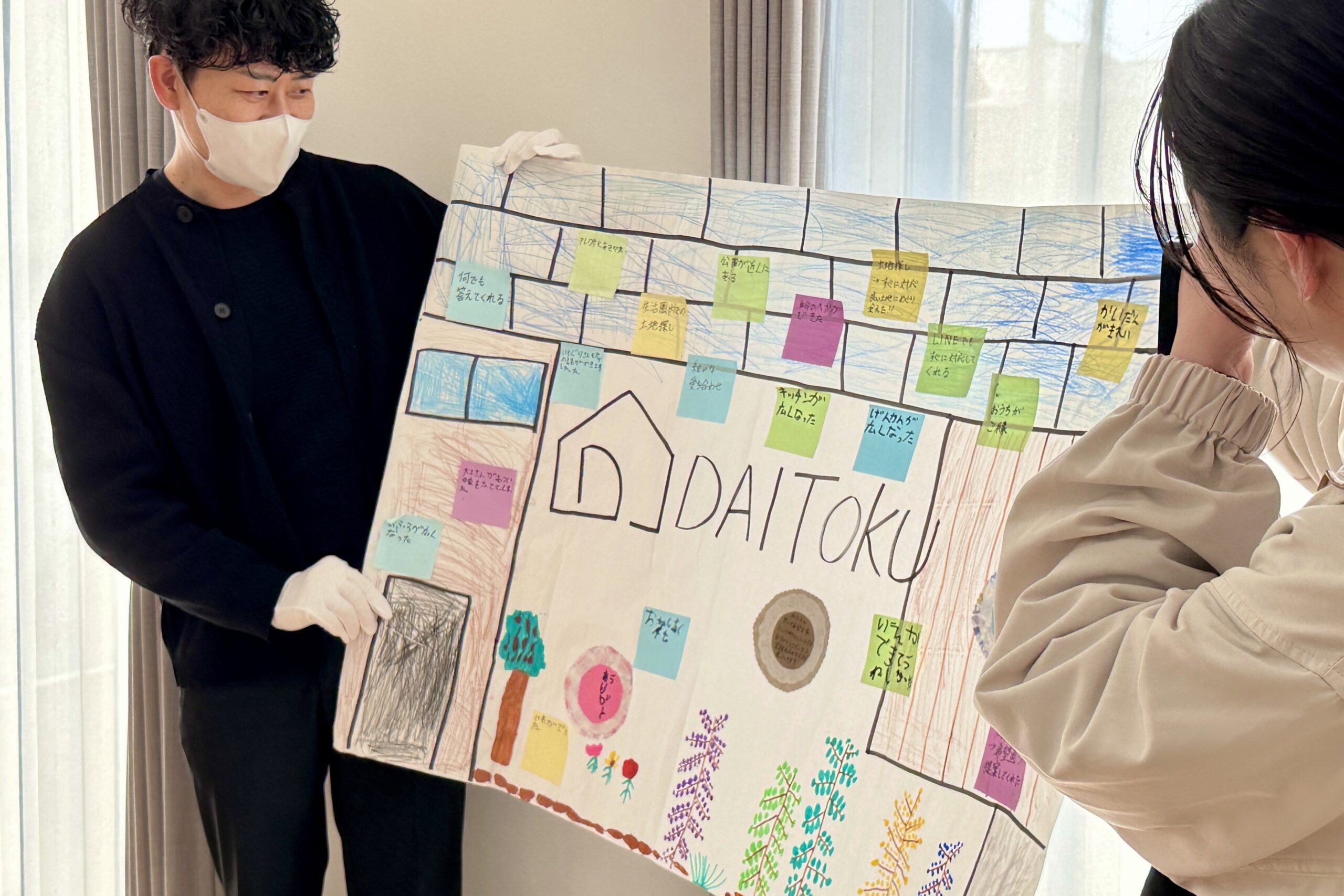 家づくりを考え始めたきっかけは、同じ保育園の友人がDAITOKUさんで建てた家に遊びに行ったことでした。ガルバリウムの外観や家全体の雰囲気がとても素敵で、「こういう家いいね」と夫婦で話したのを覚えています。ちょうど見学会も開催されていて、軽い気持ちで参加したのが始まりでした。