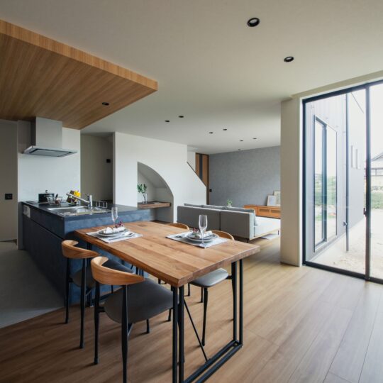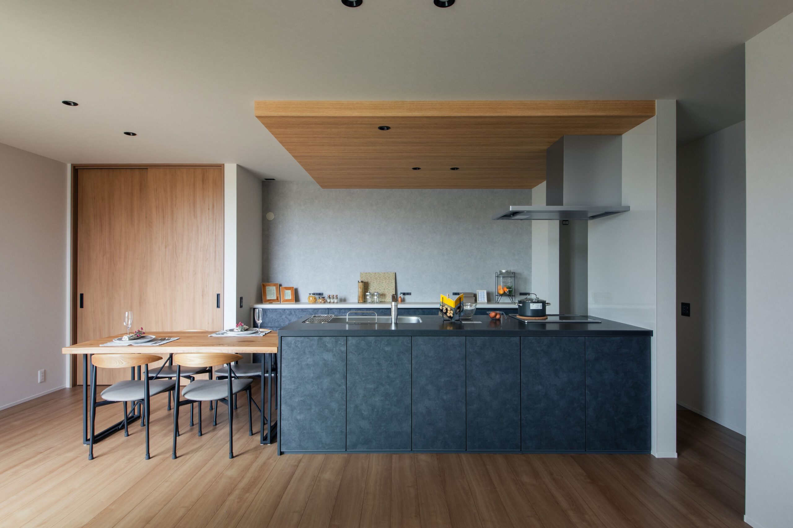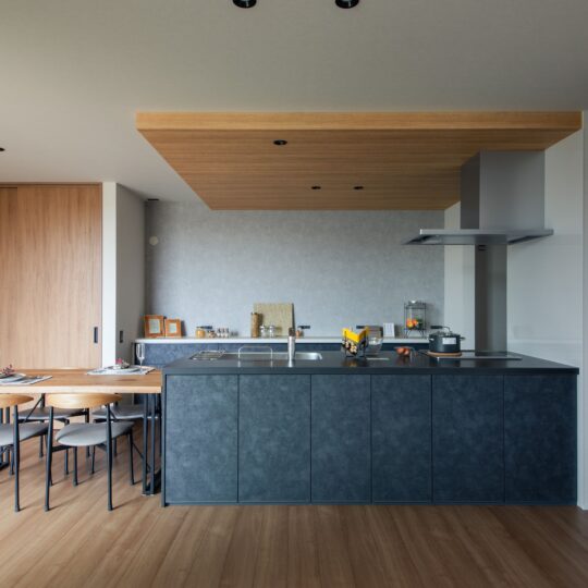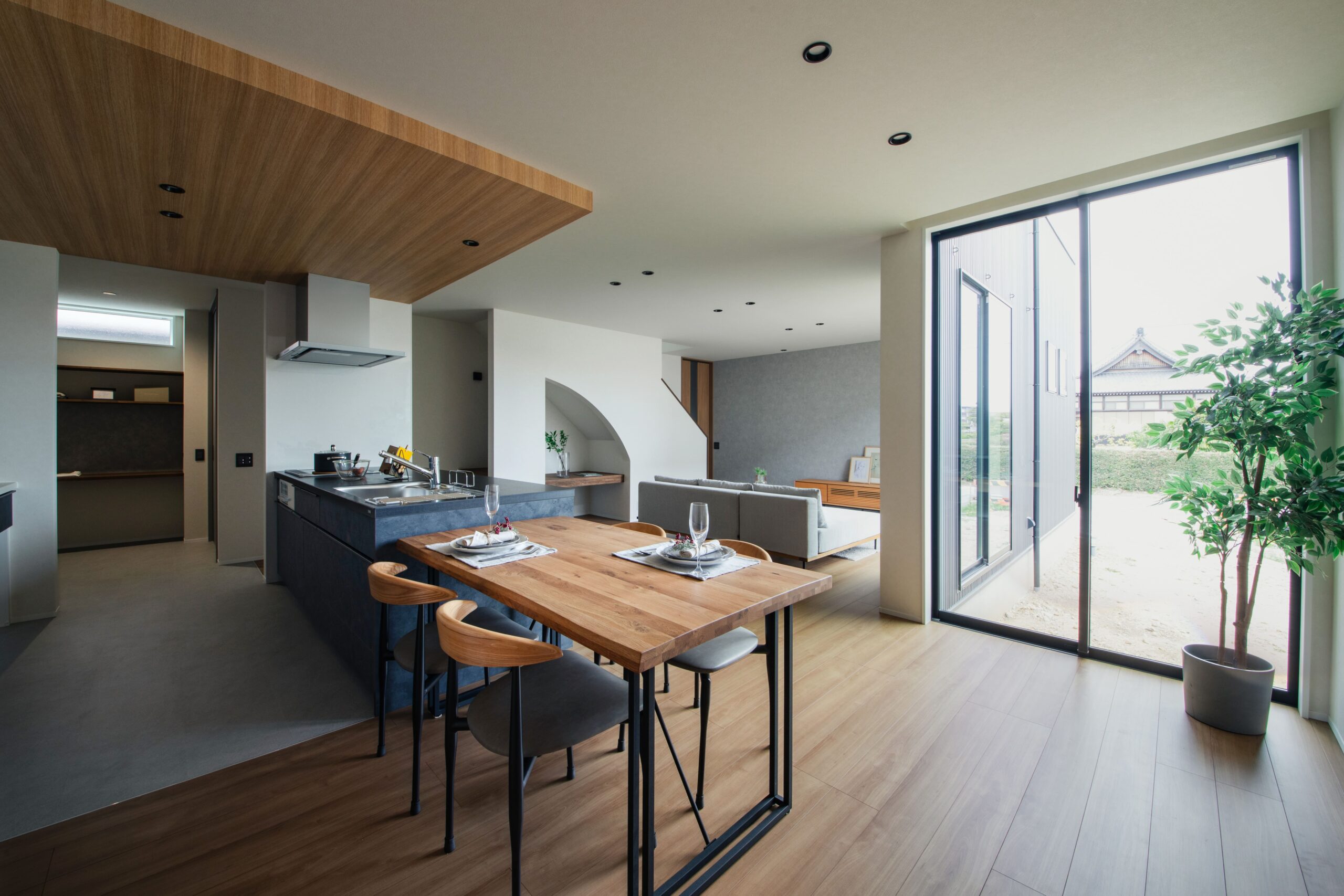 39坪4LDKの二階建てのお家。26畳の広々としたLDKは、大きな窓からやわらかな光が差し込み、ご家族が自然と集まる空間です。中心に配置したアイランドキッチンはぐるりと回れる回遊動線で、料理をしながらリビングで遊ぶ子どもたちを見守れる安心設計。横並びのダイニングで配膳や片付けもスムーズに行え、忙しい毎日の負担を軽減します。